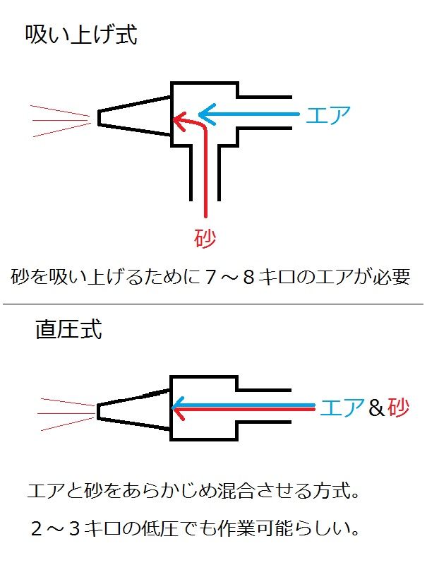 直圧式サンドブラスト 自作 塩ビ-塩ビパイプ 1 0 排気用フード取付け用 サンドブラスト加工に最適 サンドブラスター(ホース式)新品 バイクのレストアには欠かせないサンドブラストを行うため、ブラストキャビネット を自作することにしました。直圧サンドブラスターへの道 13/ 1/ 28 走行距離56,000km 購入したサンドブラストボックスが吸い上げ方式でした。この吸い上げ式は、圧縮空気の消費が多すぎてコンプレッサーが唸りっぱなし。